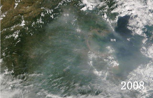 2008是北京奥运会,为了能够有一个好的空气迎接北京2008年奥运会及残奥会,从7月份开始,北京实施单双号限行,关闭京津翼附近工厂及大的工程。卫星图能够很好的看到效果。
