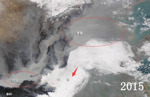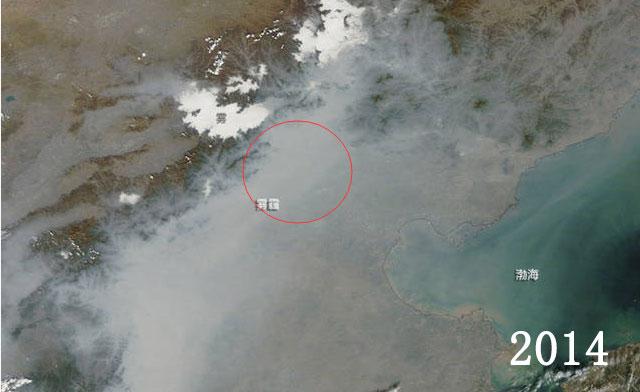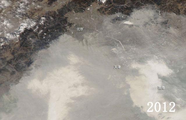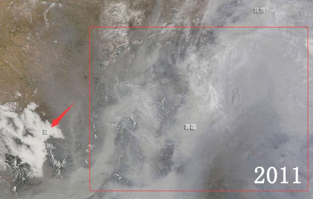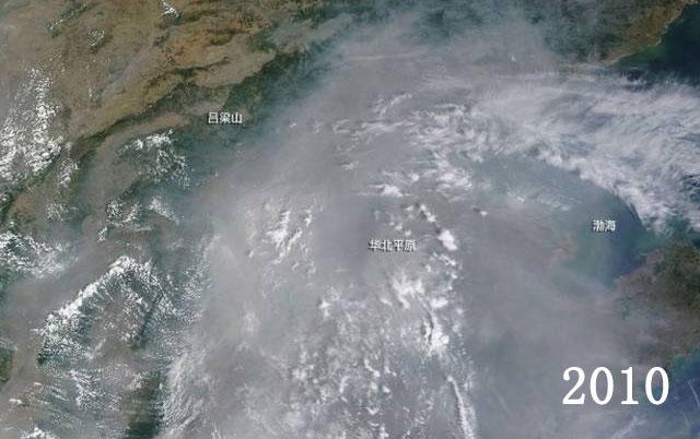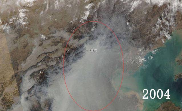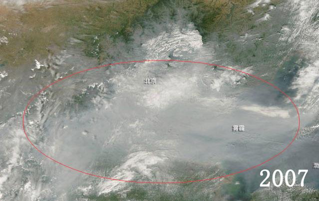 从2007年的图我们可以看到北京地区的雾霾已经非常严重,雾霾跟云层相混合后完全的遮蔽住了北京。