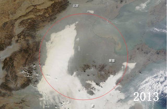 2013年12月是中国历史上空气污染最为严重的一次,我们已经无法从图中获取地面的任何信息,所有的一切都被厚厚的深灰色雾霾遮盖,污染从华北地区延伸到东北地区,南方地区则不受影响。