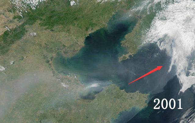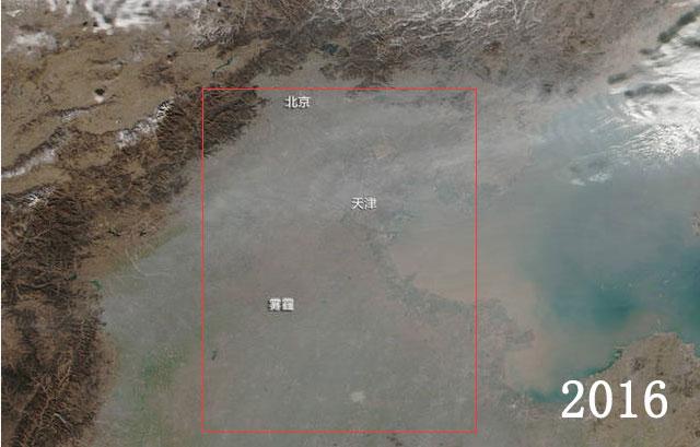 上图为2001年MODIS拍摄的中国华北地区图像。从图中我们能够清楚的看到在朝鲜方向有一片灰色的云(气溶胶污染)。而在京津翼地区还能够清楚的看到陆地表层绿色地带(图片拍摄于夏季7月份)。