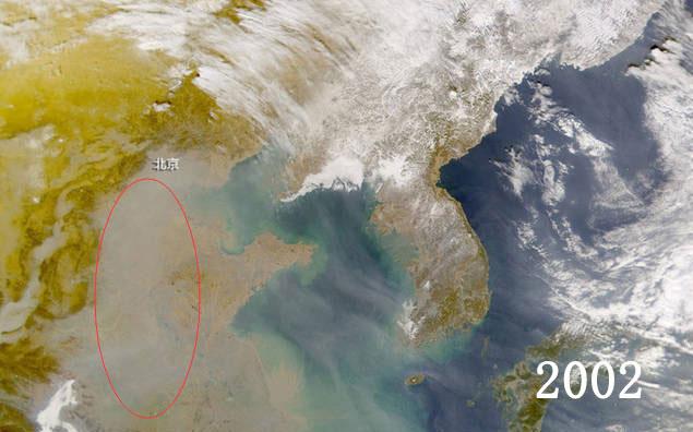 到了2002年年初的时候,京津翼地区受灰色云影响,已经无法看到地表层的细节,图像呈蜡的,北京上海等地受到的灰色气溶胶污染最严重,能够清晰的看到被状覆盖的上空有一片灰色的云带。