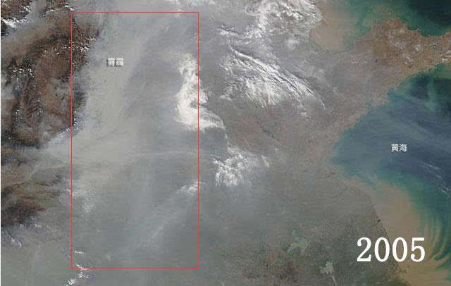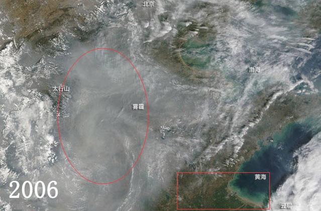 不过2006年大部分雾霾云层向西移动,导致太行山以东地区空气浑浊,而沿海地区则能够看到地表植被,空气质量有所好抓。