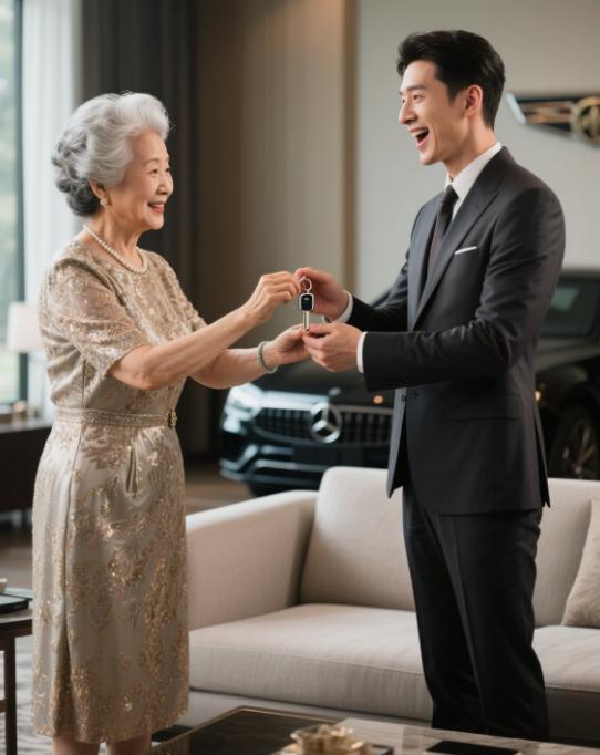 六十三岁的刘桂花坐在主位上,手里握着两样东西——一张崭新的公交卡和一串奔驰车钥匙。她的两个女婿坐在对面,神情各异。